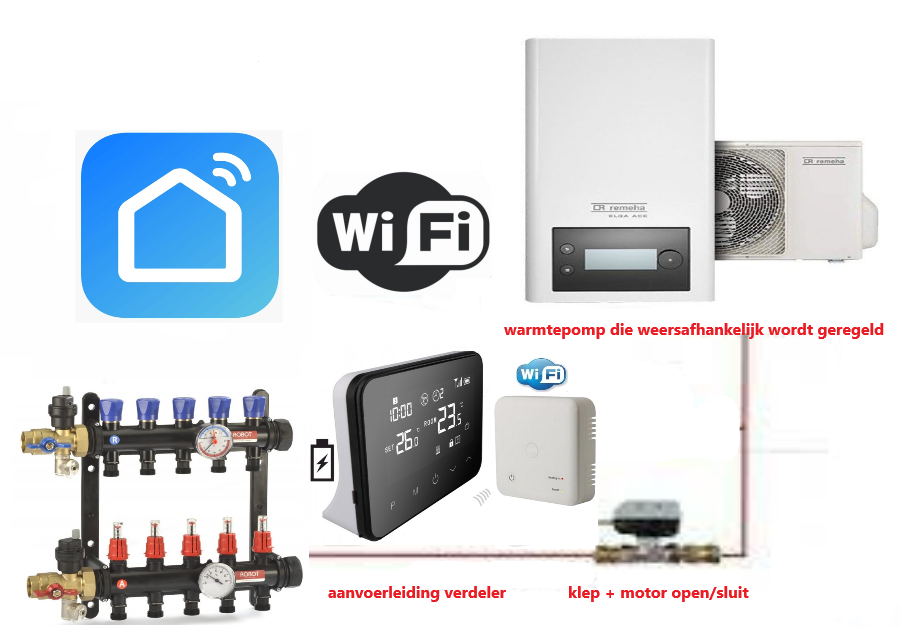De warmtepomp zelf heeft zijn eigen thermostaat (protocol) en daar regelt hij de tempratuur mee. Dan kunnen er wel regelingen geplaatst worden maar deze regelen niet de warmtepomp en doen dus alleen open en sluiten van kleppen naar de verschillende ruimtes (zie ook Master-Master of Master-Slave op deze pagina).